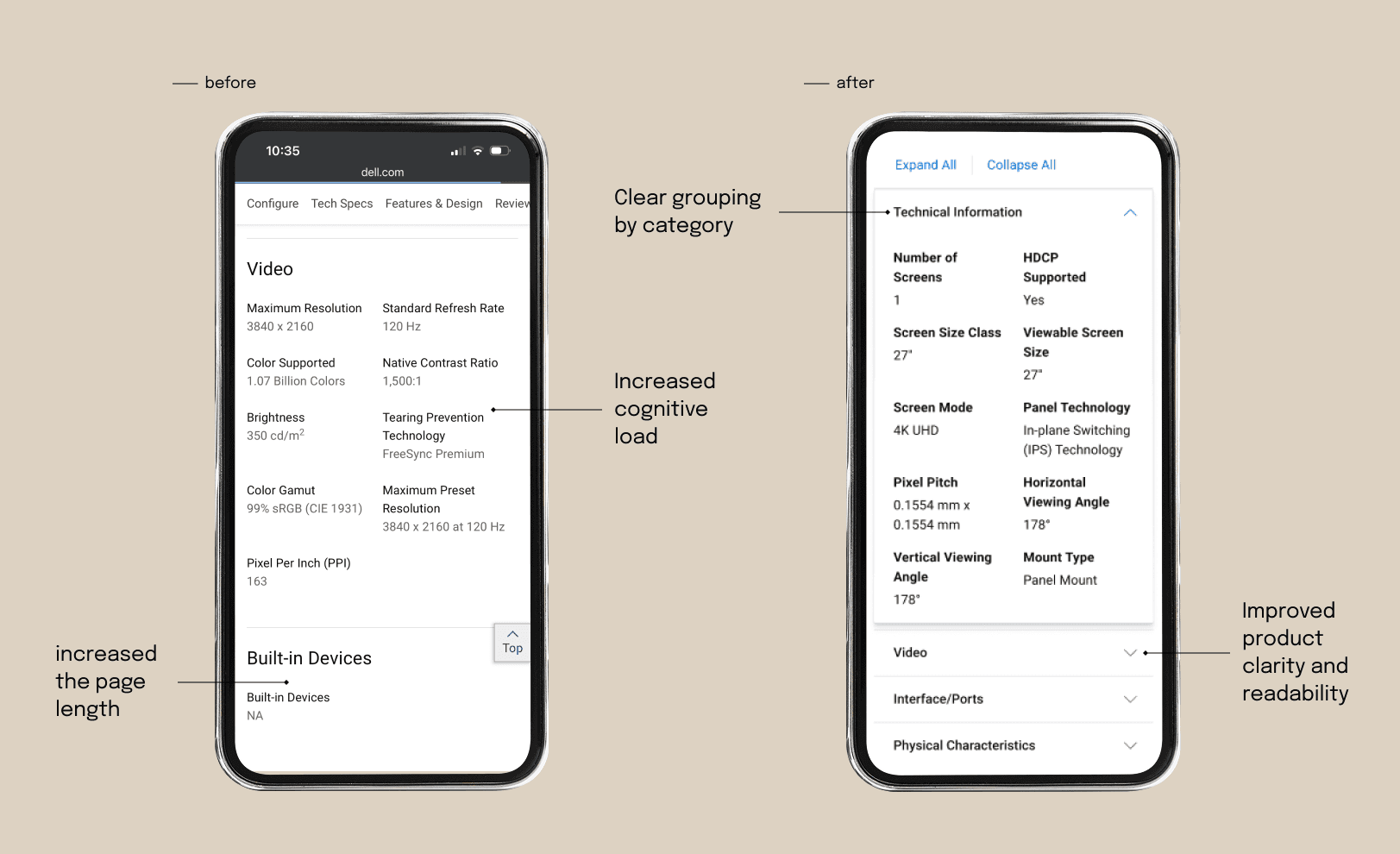 I conducted an A/B test in mobile and desktop comparing the original technical specifications layout with a structured, column-based version informed by industry research. The goal was to validate whether improved readability and grouping would reduce decision friction and increase engagement on PDPs.