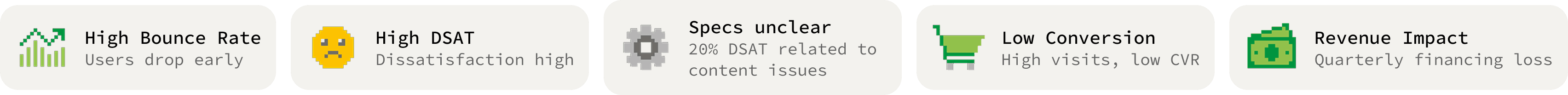 Dell.com Product Detail Pages attracted high traffic but failed to convert consistently. High bounce rates, elevated DSAT, and content-related confusion (20% of negative feedback) indicated significant decision friction. Users reached PDPs with intent but lacked the clarity needed to confidently purchase, resulting in low conversion rates and measurable quarterly revenue loss.